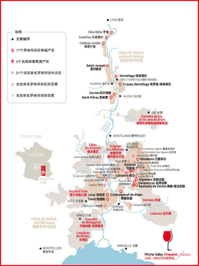 發(fā)源于阿爾卑斯山(Alps)的羅納河(Rhone River)是法國的主要河流之一,它綿延800余公里,最終向南流入地中海,也滋養(yǎng)了法國最重要的葡萄酒產(chǎn)區(qū)之一——羅納河谷葡萄園(Rhone Valley Vineyards),是這里名副其實(shí)的“母親河”。