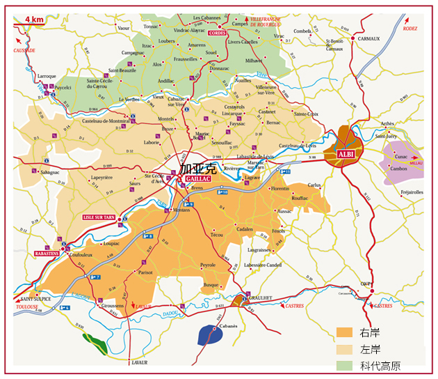 加亞克的3大主要子產(chǎn)區(qū)分別為右岸(Rive Droite)、左岸(Rive Gauche)和科代高原(Plateau Cordais)。其中位于塔恩河(Tarn River)以南的右岸產(chǎn)區(qū)地勢高,可俯瞰整個塔恩河。該產(chǎn)區(qū)的葡萄園以黏土和石灰?guī)r土壤為主,出產(chǎn)著優(yōu)質(zhì)的莫札克和布洛可。其中由莫札克釀成的酒既有優(yōu)雅柔順且回味悠長的干型白葡萄酒,又有芳香馥郁的甜酒,而布洛可紅葡萄酒則充滿水果和香料風味。塔恩河以北的左岸產(chǎn)區(qū)地勢較低,以鵝卵石、砂土和礫石為主,有著孕育優(yōu)質(zhì)紅葡萄酒的杰出風土。這里出產(chǎn)的杜拉斯紅葡萄酒風格強勁有力、單寧圓潤,而白葡萄酒雖不比右岸的脆爽,但采用蘭德樂釀成的白葡萄酒卻有著出色的復雜度。此外,該產(chǎn)區(qū)還出產(chǎn)著品質(zhì)優(yōu)異的遲摘(Late Harvest)葡萄酒。位于加亞克北部的科代高原以石灰?guī)r為主,其出產(chǎn)的白葡萄酒擁有清新的花香和果香,紅葡萄酒口感平衡、適宜陳年,桃紅葡萄酒果味芳香、酒體輕盈。