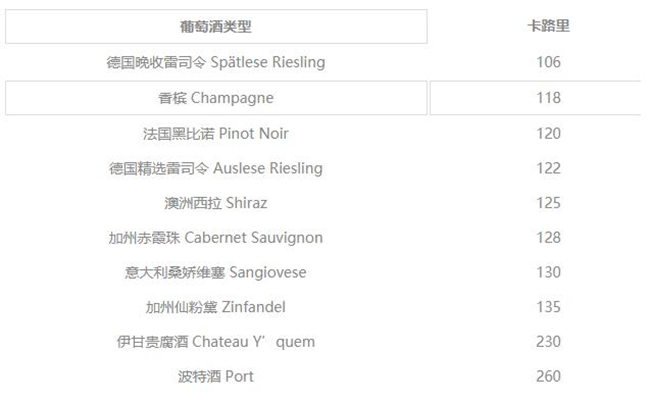 幾種常見類型的葡萄酒所含熱量之對比(150ML)
