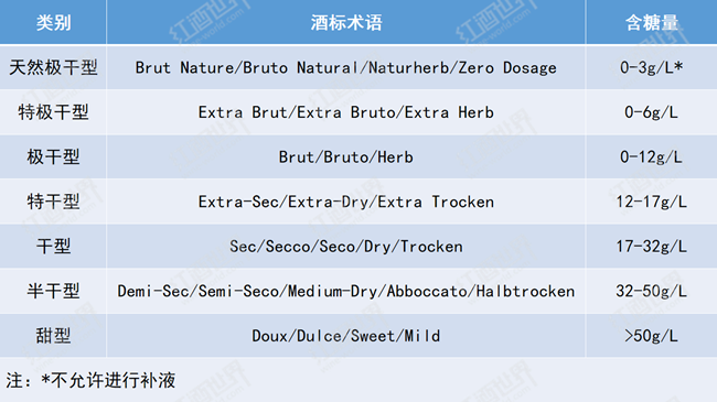 以上的分類(lèi)方法主要適用于靜止葡萄酒,而起泡酒的含糖量分類(lèi)與靜止葡萄酒不同,也更為細(xì)化,具體可參照下表。
