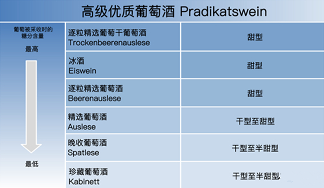 在德國(guó),PDO葡萄酒的產(chǎn)量最大,而其中高級(jí)優(yōu)質(zhì)葡萄酒占有非常重要的地位。由于氣候寒冷,葡萄的成熟度對(duì)于德國(guó)葡萄酒來(lái)說(shuō)至關(guān)重要,于是法律根據(jù)葡萄采收時(shí)的成熟度,又將高級(jí)優(yōu)質(zhì)葡萄酒細(xì)分為以下6個(gè)等級(jí)。別看它很復(fù)雜,但只要將這一分級(jí)看做葡萄酒的風(fēng)格劃分,理解起來(lái)就很容易了。