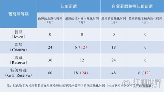 除了跟隨法國和歐盟的腳步之外,西班牙葡萄酒的分級也有著自己的特色,那就是對于DO及以上級別葡萄酒最短的總熟化時間和在橡木桶內(nèi)熟化時間的要求。西班牙根據(jù)熟化時間將葡萄酒分為4個等級:新酒(Joven)、陳釀(Crianza)、珍藏(Reserva)和特級珍藏(Gran Reserva),這幾個術(shù)語也是我們常在西班牙紅酒的酒標(biāo)上見到的。各級別對于熟化時間的要求見下表: