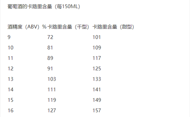 在常見(jiàn)的酒精飲料里面,葡萄酒的卡路里含量是比較低的。以每150ML計(jì)算,干型葡萄酒的卡路里大約在70~130之間波動(dòng),主要由葡萄酒的酒精含量決定。而甜型葡萄酒的卡路里含量則會(huì)更高一些(見(jiàn)下表)。