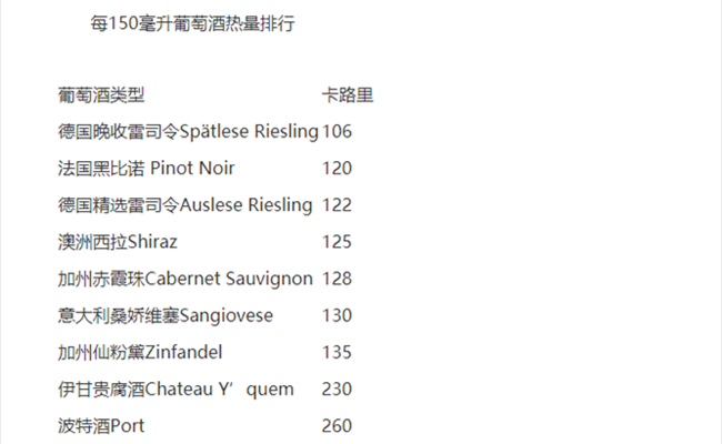 不同葡萄品種的葡萄酒在熱量上也會(huì)有差別。如果你對(duì)上表感到迷惑,而且對(duì)卡路里的數(shù)字又很敏感,下方表格內(nèi)的數(shù)字可以提供更加具體的參考。