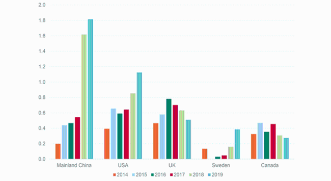 從對(duì)全球的出口價(jià)格來看,價(jià)格高于10澳元每升的歌海娜表現(xiàn)尤為突出,出口額從2014年的120萬澳元增長至2019年的400萬澳元,這一價(jià)格區(qū)間的歌海娜出口額占據(jù)了所有價(jià)格區(qū)間的歌海娜總出口額的72%。