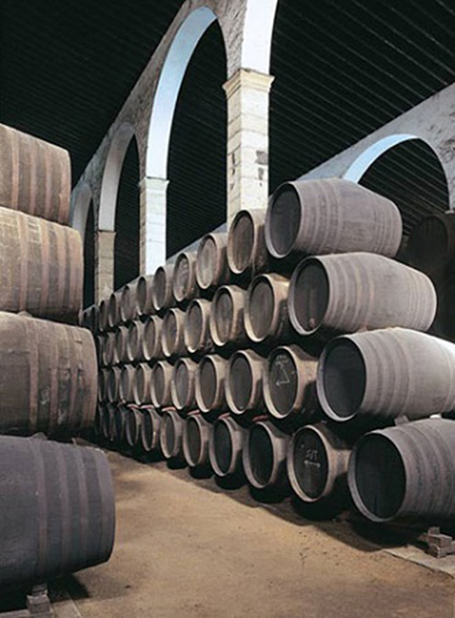 雪莉酒的強化發(fā)生在基酒發(fā)酵結(jié)束后,一般通過混入部分酒精濃度高達96%abv的蒸餾烈酒來將葡萄酒的酒精度提升至15-15.5%abv或17%abv。然后,酒液會轉(zhuǎn)入獨特的索萊拉(Solera)系統(tǒng)進行熟化。這種系統(tǒng)的特點在于將不同熟化期的酒液分層存放,然后在熟成過程中每隔一段時間就將年輕酒液與熟化較久的酒液混合,以保證每次釀出的雪莉酒風格一致,且品質(zhì)穩(wěn)定。雪莉酒的風味大多源自該熟化階段,其風格也與熟化時長和熟化方式等息息相關(guān)。