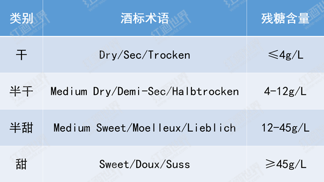 根據(jù)酒液中的殘?zhí)橇浚藗儗㈧o止葡萄酒分成了四個類別:干型(Dry)、半干型(Medium)、半甜型(Medium Sweet)和甜型(Sweet)。
