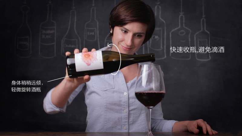 當(dāng)?shù)咕普吒械奖械木屏靠煲_(dá)到要求時(shí),可將身體稍稍遠(yuǎn)離酒瓶,再輕微旋轉(zhuǎn)酒瓶底部并快速收瓶,這樣就能在沒有任何工具護(hù)佑的情況下也能避免滴酒。當(dāng)然,這是一個(gè)需要不斷練習(xí)的動(dòng)作。