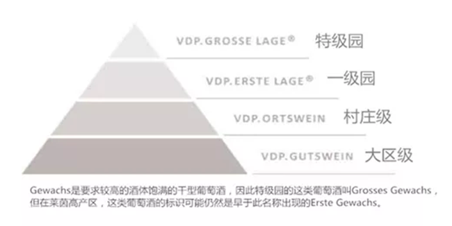 現(xiàn)在越來越能代表德國雷司令葡萄酒級別的是德國名莊聯(lián)盟(Verband Deutscher Pradikatsweinguter,簡稱VDP)倡導(dǎo)的針對葡萄果實天然特性進行的分類,即好葡萄酒不應(yīng)該只擁有足夠高的潛在酒精度,還應(yīng)該具有一定的原產(chǎn)地和其他方面的特色。
