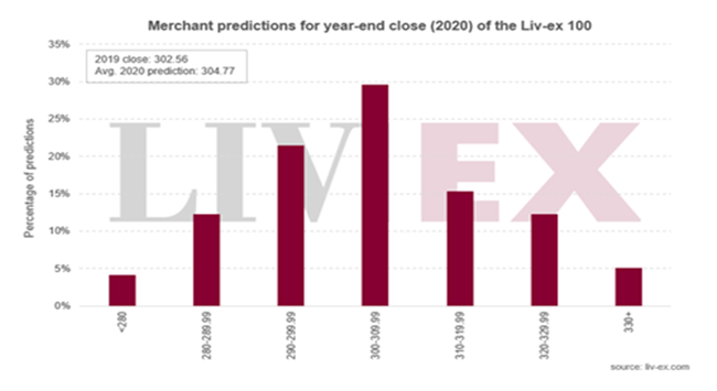 今年,Liv-ex會員預(yù)測優(yōu)質(zhì)葡萄酒市場將在2020年持平。平均而言,受訪者預(yù)測此行業(yè)基準指數(shù)將上升0.7%,收于304.77點。 預(yù)測的中位數(shù)則稍低,為303.00點,上升0.1%。