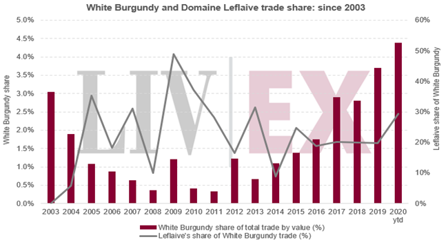 在二手市場上,勒弗萊Leflaive葡萄酒占了勃艮第白葡萄酒很大部分的交易。 2009年,雖然勃艮第白葡萄酒僅占總交易1.2%,但當(dāng)中勒弗萊卻占了一半以上。 本年至今,勃艮第白葡萄酒占總交易已增至4.3%;當(dāng)中勒弗萊也占近三分之一。