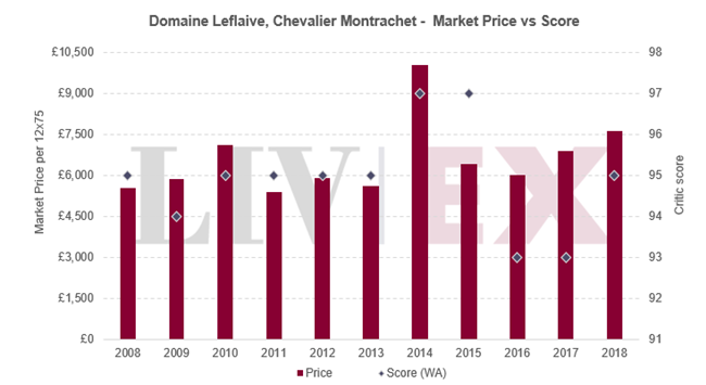 最后,下圖比較了勒弗萊的Chevalier Montrachet(該品牌交易最活躍的葡萄酒)最近十個(gè)年份的市場價(jià)格。 它最新的2018年份自去年12月在英國發(fā)布以來,市場價(jià)格已漲了19%。