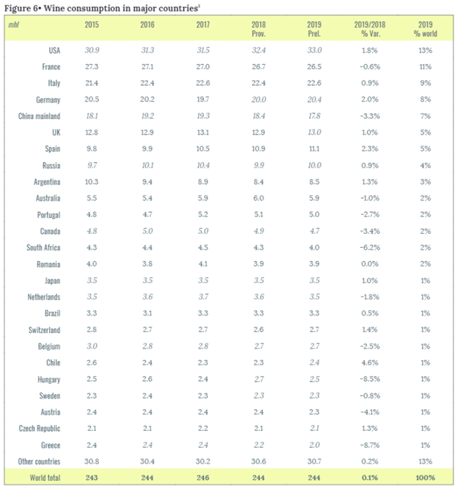 (2015—2019主要國(guó)家的葡萄酒消費(fèi))
