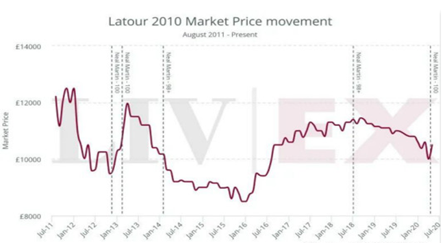 有跌有升,在接下來(lái)的幾年,此酒的價(jià)格開始隨大市走強(qiáng)而上升。然而,在2018年再次被確認(rèn)98+分后,價(jià)格又再次波動(dòng)。如今,此酒比其2011年時(shí)的前倫敦發(fā)行價(jià)(11,000英鎊 每箱12×75)折價(jià)5%。