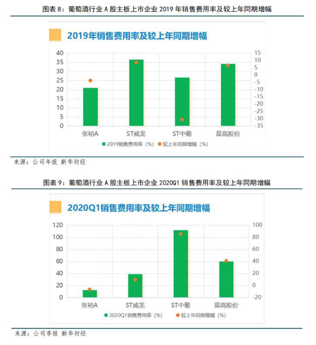 銷售費(fèi)用率水平一定程度上反應(yīng)了酒企在品牌和渠道建設(shè)上做出的努力。2019年四家葡萄酒企銷售費(fèi)用率高于20%,行業(yè)整體處于高位水平,這也在一定程度上反應(yīng)出葡萄酒市場(chǎng)競(jìng)爭(zhēng)更加激烈。其中,ST威龍表現(xiàn)最突出,2019年銷售費(fèi)用率達(dá)36.4%,較上年同期增幅8.45%,其年報(bào)解釋稱主要是報(bào)告期內(nèi)促銷費(fèi)增加所致。