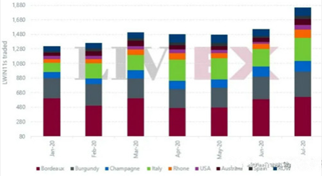 2020年上半年交易的獨(dú)立葡萄酒數(shù)量比2019年同期增長了37%。下半年初更加強(qiáng)勁,7月份交易的獨(dú)立葡萄酒數(shù)量(LWIN7)更首次突破1,000;并比之前最高月份高出超過20%(如下所示)。