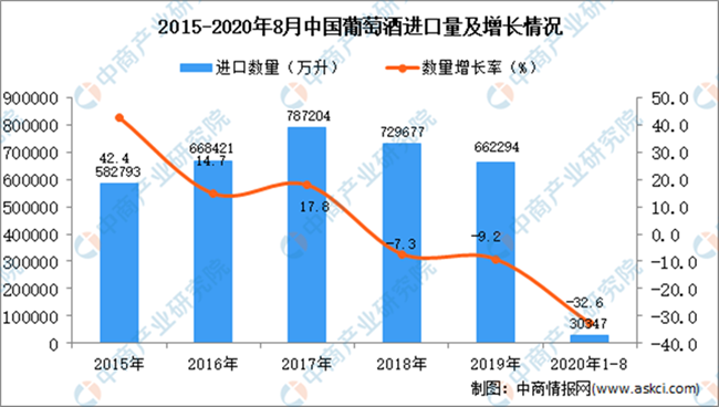 據(jù)中商產業(yè)研究院數(shù)據(jù)庫顯示,2020年1-8月中國葡萄酒進口量下降,2020年1-8月中國葡萄酒進口量為32.6萬升,同比下降32.6%。