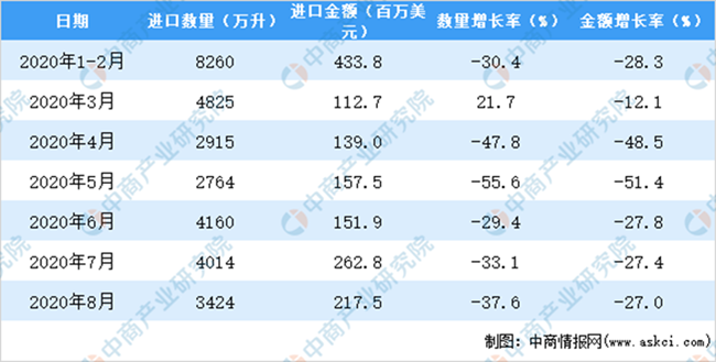 2020年1-8月中國葡萄酒進口量及金額增長情況