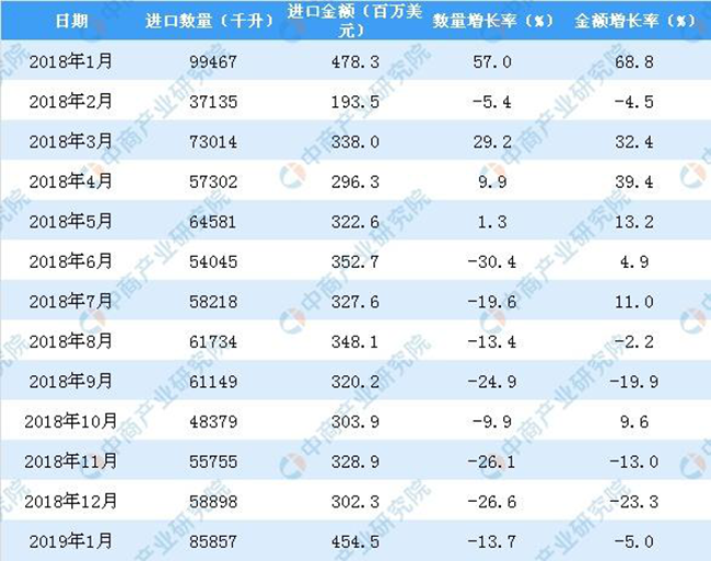 據(jù)中商產(chǎn)業(yè)研究院數(shù)據(jù)庫(kù)顯示,2013年-2017年中國(guó)葡萄酒進(jìn)口量增長(zhǎng),共增長(zhǎng)381347千升,增長(zhǎng)93.96%;2018年中國(guó)葡萄酒進(jìn)口量回落,2019年1月中國(guó)葡萄酒進(jìn)口量為85857千升,同比下降13.7%。