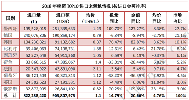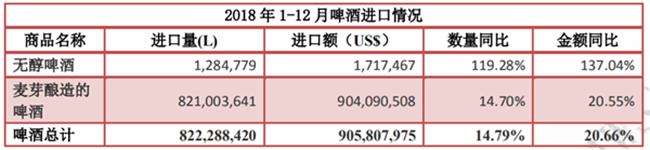 2018 年,啤酒進(jìn)口增長(zhǎng)提速,進(jìn)口量 8.2 億升,同比增長(zhǎng) 14.8%,進(jìn)口額 9.1 億美元,同比增長(zhǎng) 20.1%,約占酒類進(jìn)口總額的 15.7%,位列進(jìn)口酒類第三位。