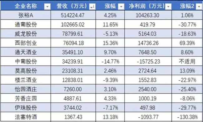 2018年被認(rèn)為是中國葡萄酒行業(yè)的調(diào)整之年,整個(gè)葡萄酒行業(yè)呈現(xiàn)出小幅下滑的局面,據(jù)國家統(tǒng)計(jì)局?jǐn)?shù)據(jù),2018年全國規(guī)模以上葡萄酒企業(yè)總產(chǎn)量62.9萬千升,比2017年下降7.36%;累計(jì)實(shí)現(xiàn)銷售收入288.51億元,同比下降9.51%;累計(jì)實(shí)現(xiàn)利潤總額30.63億元,同比下降9.46%。這12家上市企業(yè)發(fā)布的年報(bào)數(shù)據(jù),與去年整年的行業(yè)氛圍相符。大概也正是因?yàn)槿ツ晷袠I(yè)“看跌”的聲音不絕于耳,提前打了“預(yù)防針”,當(dāng)全年數(shù)據(jù)公布和12家公司年報(bào)披露時(shí),行業(yè)沒有表現(xiàn)出很大的落差。