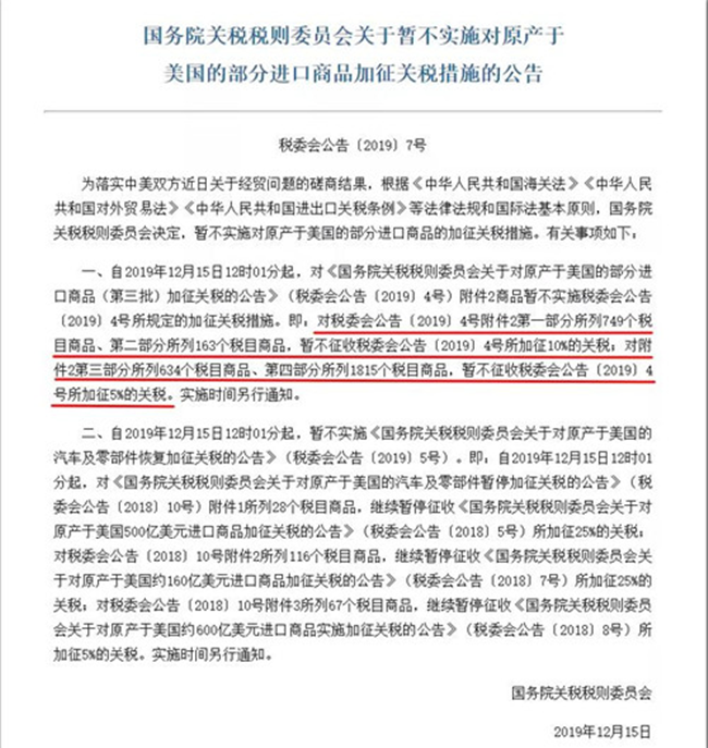 作為回應(yīng),中國將購買更多的美國農(nóng)產(chǎn)品,增加美國公司進(jìn)入中國市場的機(jī)會(huì)。因此,中國國務(wù)院關(guān)稅稅改委員會(huì)發(fā)布公告,將暫停實(shí)施原計(jì)劃于 2019 年 12 月 15 日 12 時(shí) 01 分起實(shí)施的《國務(wù)院關(guān)稅稅則委員會(huì)關(guān)于對原產(chǎn)于美國的部分進(jìn)口商品(第 3 批)加征關(guān)稅的公告》加征關(guān)稅措施。具體政策如下: