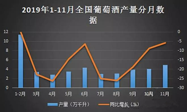 一方面是昂揚(yáng)向上的精神勁頭,另一方面全國(guó)葡萄酒產(chǎn)量數(shù)據(jù)卻為其潑了一盆冷水。根據(jù)中國(guó)報(bào)告大廳對(duì)2019年1-11月全國(guó)葡萄酒產(chǎn)量進(jìn)行監(jiān)測(cè)統(tǒng)計(jì)顯示:2019年11月全國(guó)葡萄酒產(chǎn)量4.9萬(wàn)千升,同比下降5.8%,2019年1-11月全國(guó)葡萄酒產(chǎn)量為37.2萬(wàn)千升,累計(jì)下降12.1%。