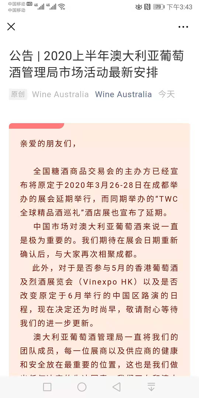 2月5日,澳大利亞葡萄酒管理局市場部總經(jīng)理Stuart Barclay在一份公告中表示,中國市場對澳大利亞葡萄酒來說一直是極為重要的。“我們期待在展會日期重新確認后,與大家再次相聚成都。”