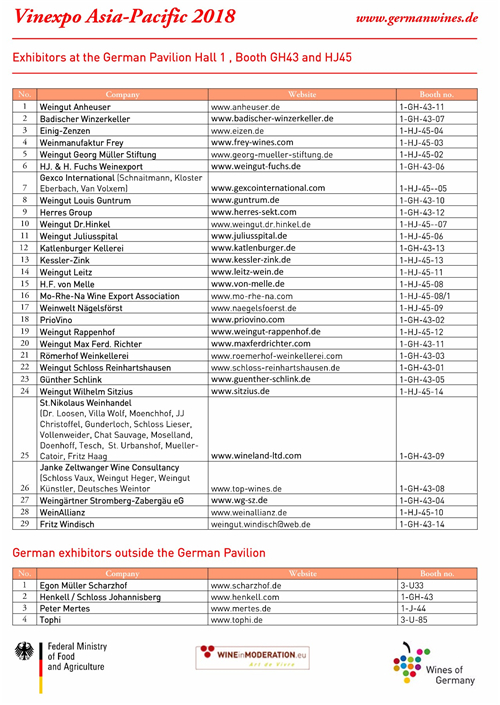 2018 年 5 月 29-31 日,Vinexpo 香港展將在香港會議展覽中心迎接其第20周年的到來。在此之際,德國聯(lián)邦食品和農(nóng)業(yè)部將再次組織德國展團(tuán)集體參加 Vinexpo香港展,多達(dá) 29 家德國葡萄酒生產(chǎn)商或酒莊代表將會出席此次盛會。