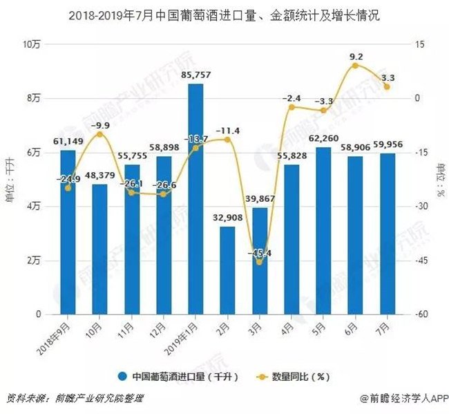 據(jù)中國海關總署數(shù)據(jù)顯示,2019年1-2季度中國葡萄酒進口量有所增長,2019年7月中國葡萄酒進口量為59956千升,同比增長3.3%。累計方面,2019年1-7月中國葡萄酒進口量達到395429千升,同比下降10.8%。